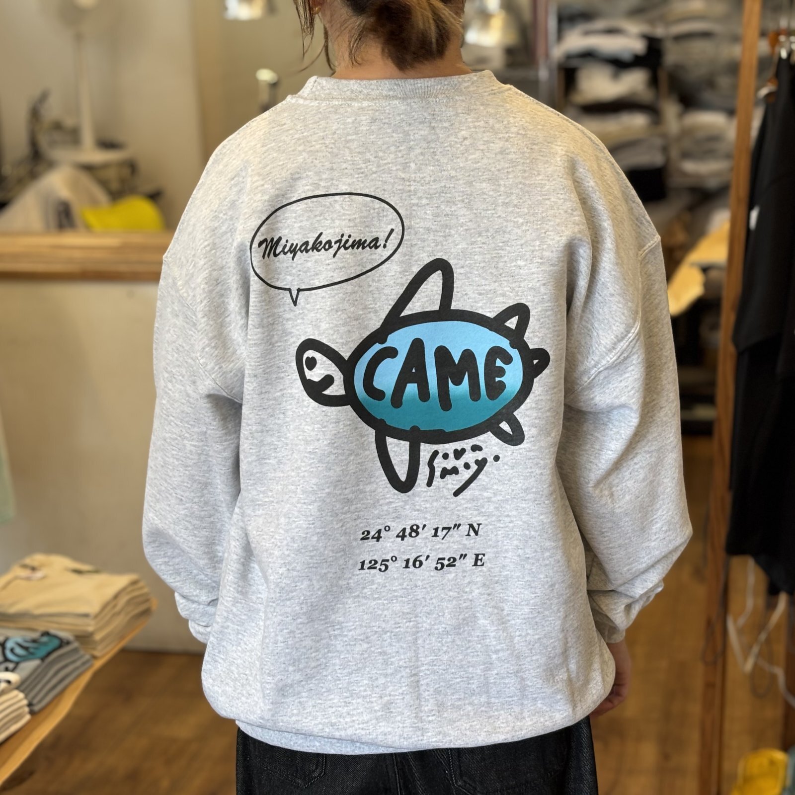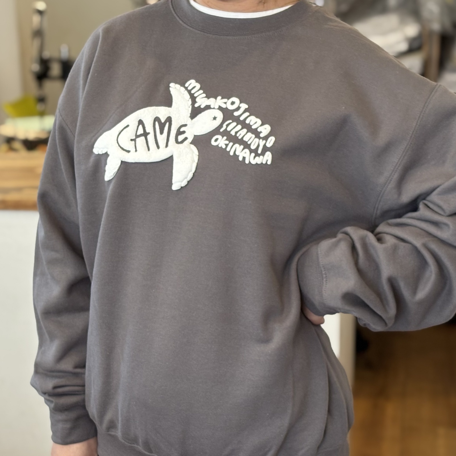 スウェットシャツのアッシュで背中にカメのデザインです。